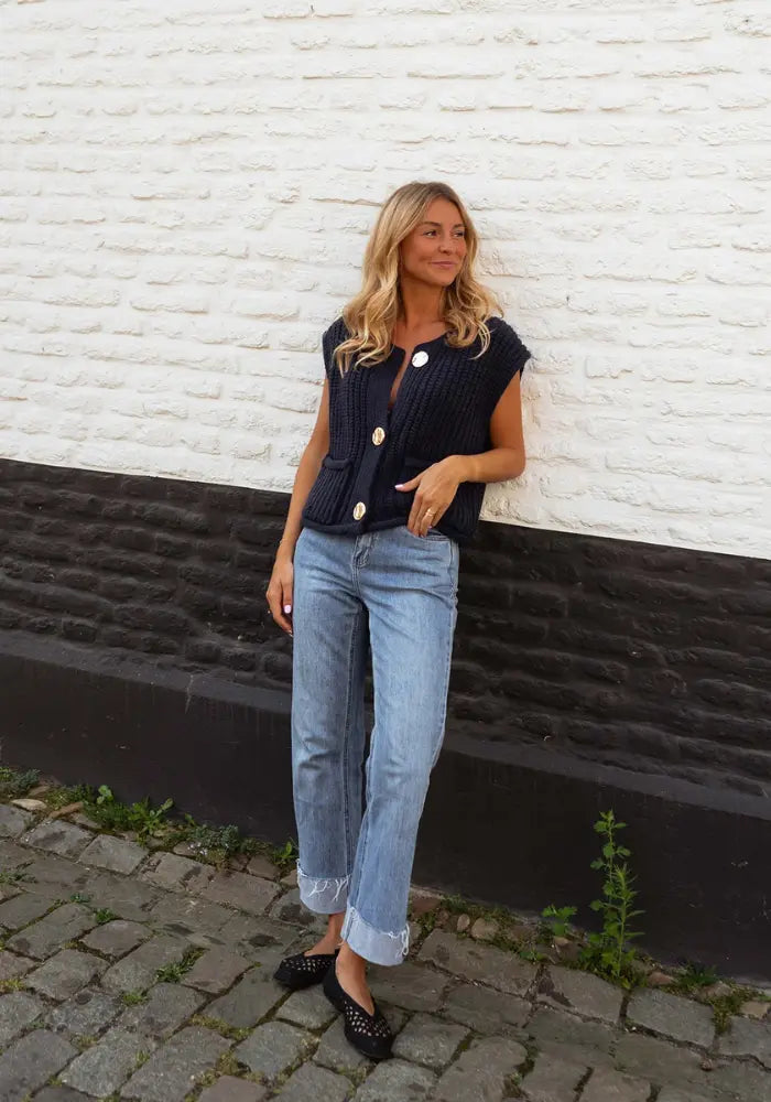 Moira™ brings casual elegance to your everyday life. The modern, shortened fit, delicate knit texture, and decorative buttons make this sleeveless vest a versatile styling favorite. Worn open, it looks relaxed and modern; closed, it emphasizes the silhouette – always comfortable, always stylish.