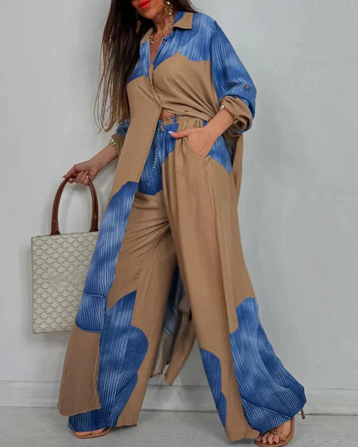 Taren™ is the perfect set for modern women who want to appear effortlessly chic. The combination of a flowing blouse and wide-cut pants combines lightness with a clear silhouette. The subtle print gives the look an artistic touch – ideal for stylish everyday moments, city appointments, or relaxed evenings.